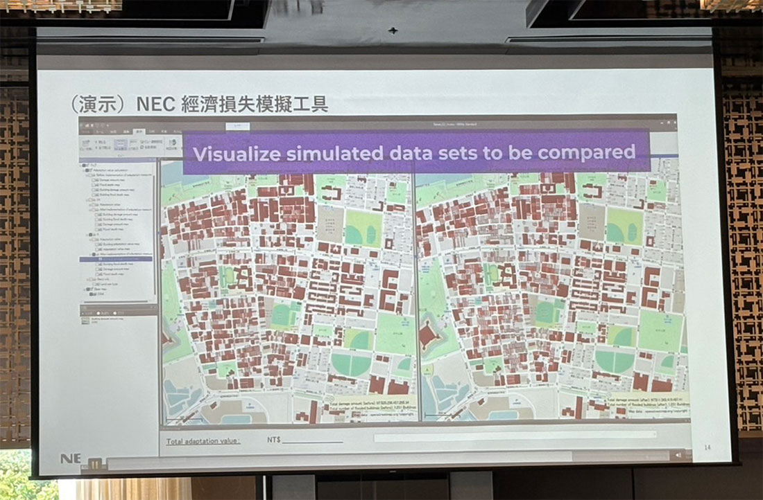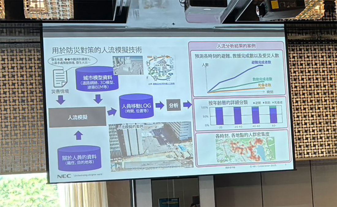 來自 NEC GX 事業開發統括部長佐藤美紀在演說中表示,防災不僅是技術問題,更是「防災經濟價值可視化」的課題。她指出,全球災害在過去五十年來次數增加五倍、經濟損失成長七倍,但防災投資僅佔整體的十八分之一,凸顯決策者缺乏量化依據。她說:「我們要讓防災投資說得更清楚,透過 AI 與 IT 技術,將風險與對策效益轉換成具體數字。」佐藤部長以印尼 BSD 新興都市的智慧排水專案為例,說明 NEC 如何透過模擬計算防災措施前後的經濟損失差異,將防災價值「可視化」。她強調,這樣的模式完全能應用於台灣,無論是預算規劃、災害發生時的即時估算,還是災後報告,都能透過數據支撐,讓資源分配更具說服力。未來 NEC 更希望與台灣在地數據與經驗結合,建立符合本地需求的防災評估系統。