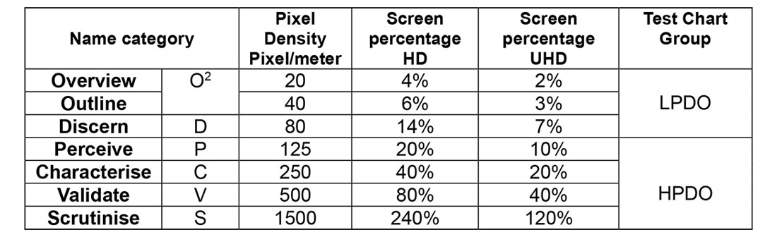 近年來影像監控系統在高解析度影像方面進展巨大。像素密度(pixels per meter, pix/m)是影像細節呈現的重要指標。像素密度越高,越能辨識出細微特徵,這對法醫分析而言極具關鍵性。新版規範全面重新定義所有像素密度,並配合全新的測試圖樣(test chart),以驗證即時影像與錄影影像的品質是否符合操作需求。此次共定義了七種全新的像素密度(品質分類),如下表所示: