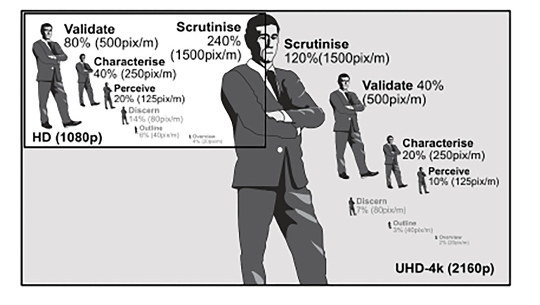 最高級別「Scrutinise」之像素密度為 1500 pix/m,其基準取自國際護照照片的人像品質標準。此級別的標準是能以「高確信度(probability on certainty)」辨識個人,同時也能清楚辨識車牌(在允許的動態模糊範圍內)及判斷車輛的型號與製造年份。「Validate」等級的像素密度為 500 pix/m,經實證足以支援多數自動人臉辨識軟體進行身份比對。此密度可用於確認已知人士、追蹤行動,以及重構車牌資訊(同樣假設動態模糊可接受)。「Overview」等級的像素密度為 20 pix/m,經證實足以支援多數影像分析功能,例如在長距離下偵測移動物體(如周界防護或邊境監控應用)。