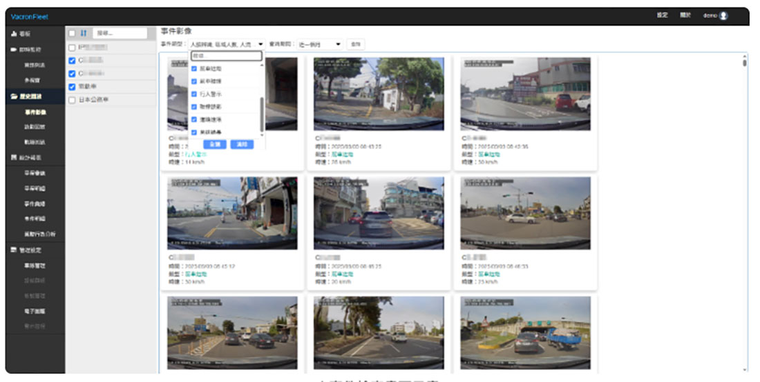圖:選擇特定設備與事件類型(包含 ADAS、DMS、BSD 等車用輔助 AI 事件),迅速鎖定目標影片。/馥鴻科技提供