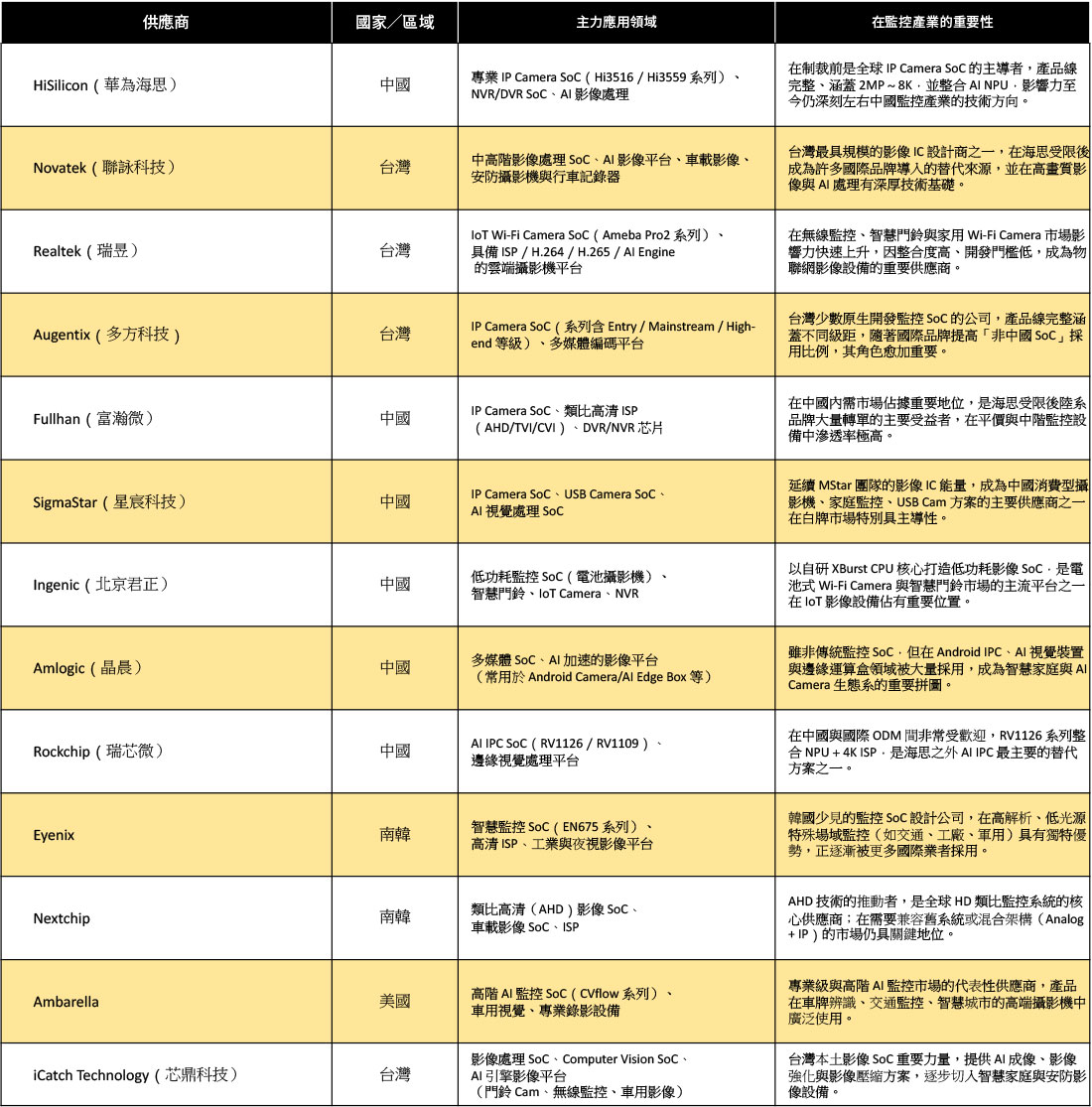 圖:全球監控影像 SoC 供應商總表 / iDS整理
