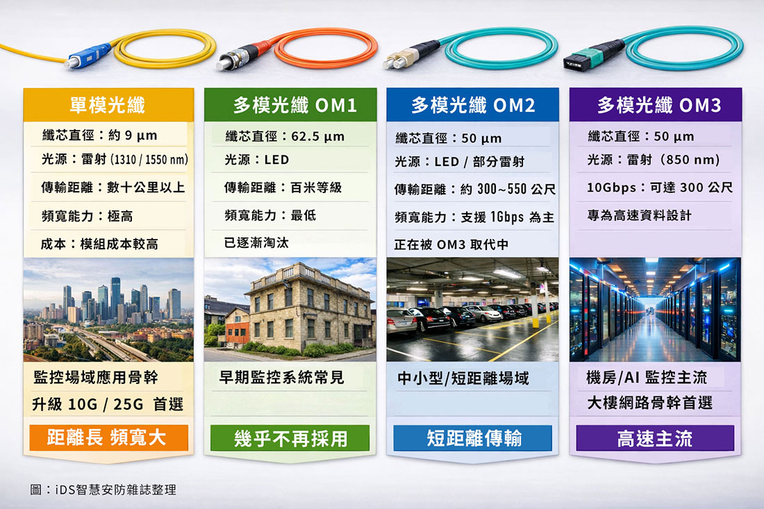 隨著安防系統逐步走向平台化運作、整合第三方系統與跨域應用,光纖所承載的內容已涵蓋高解析影像、即時事件資料、AI 分析結果與後端系統整合流量。距離長、需求高度不確定的場域或專案,採用單模光纖建立長期彈性,而建築內部與高解析度影像回傳的場域,選擇成熟穩定的多模方案。這樣的光纖規劃與施工邏輯,已成為大型公共工程與安防專案的共同共識,也才能讓現階段的智慧安防系統能夠長期可靠的正常運作。