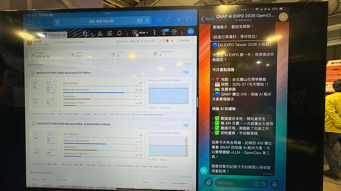 許多企業在評估 AI 應用時,對雲端服務始終抱持一定程度的保留,原因在於敏感資料一旦送往外部平台,就可能牽動資安、內控與營運風險。威聯通的 QAI 硬體設備作為地端 AI 佈局的核心,以搭載 NVIDIA 顯示卡的硬體架構,讓設備可以直接在地端環境中執行大語言模型,協助企業將 AI 演算生成與資料處理留在內部系統中完成,對重視資料不外流的企業客戶而言,具備高度吸引力,同時也有助於降低長期依賴雲端服務所產生的使用成本。威聯通也以近期話題性極高的 OpenCat「龍蝦」作為展示案例之一。透過與 Telegram 串接,系統可依照設定週期主動進行對話互動,而在每次任務啟動時,顯示卡運算資源便會快速拉升,讓使用者清楚看到地端模型正在即時執行。威連通表示,未來的AI 代理完全有機會在企業內網環境中架設部署與執行,讓使用者不必將資料傳送至雲端,也能享有生成式 AI 與自動化任務推進所帶來的效率優勢。對企業市場來說,這種私有化、可控化的導入模式,將成為未來 AI 普及的重要基礎。