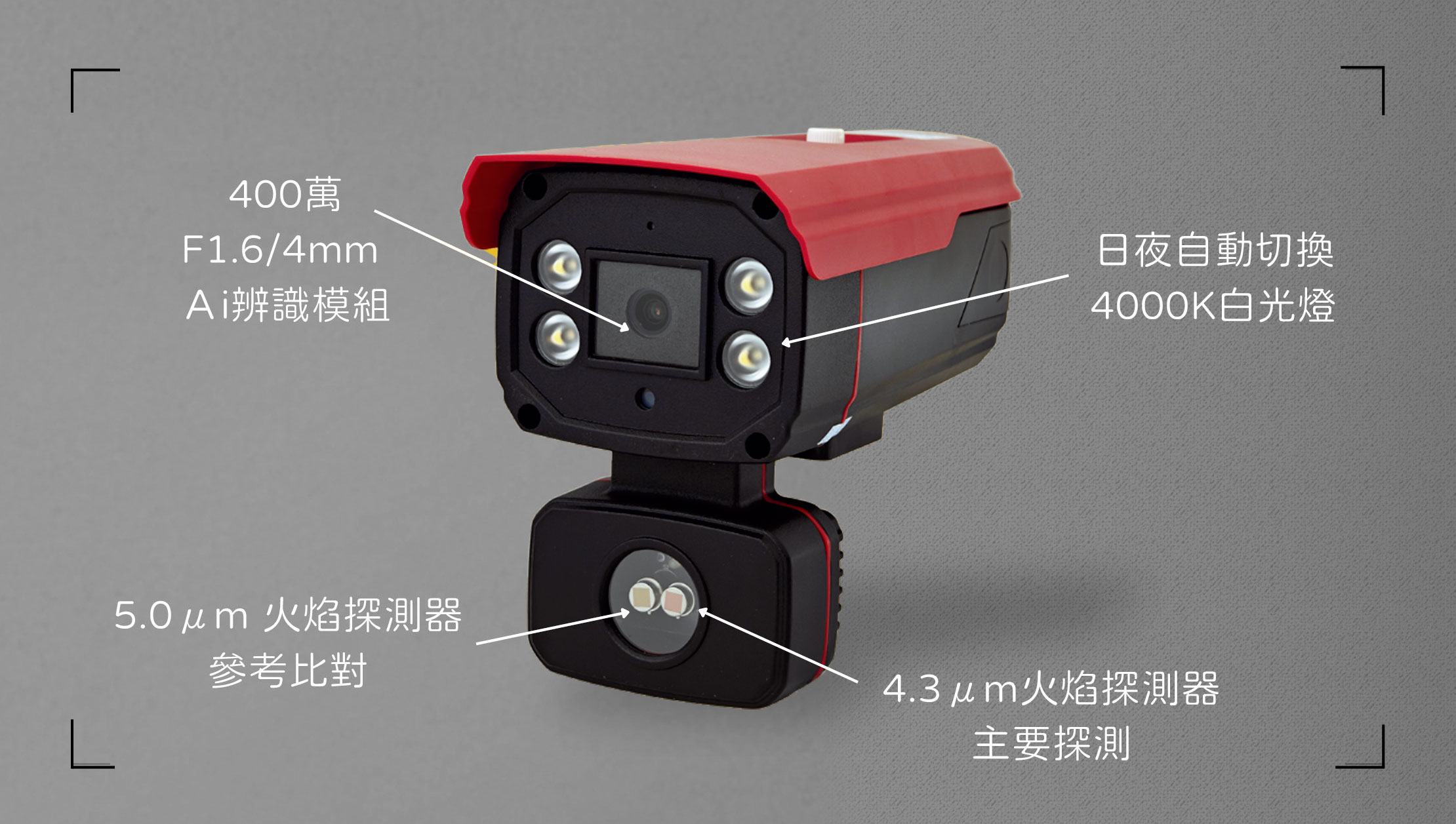 這款全新AI火焰煙霧辨識攝影機,核心亮點在於搭載兩組不同波段的火焰感測器,分別對應4.3μm與5.0μm雙重波長進行同步監測。配合自主開發的AI圖像辨識演算法,能夠即時偵測火花、煙霧等異常狀況,大幅提升火災預警的準確度。系統更進一步,針對火焰顏色進行識別,智能過濾非緊急警報,最大程度降低誤報,讓管理單位能專注於真正的危機。