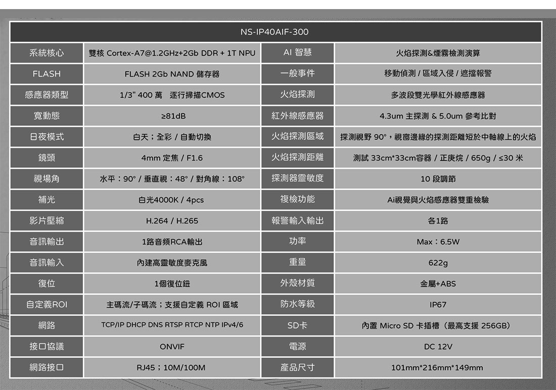 車鋁工業NSK 全新AI火焰煙霧辨識Sensor攝影機 NS-IP40AIF-300