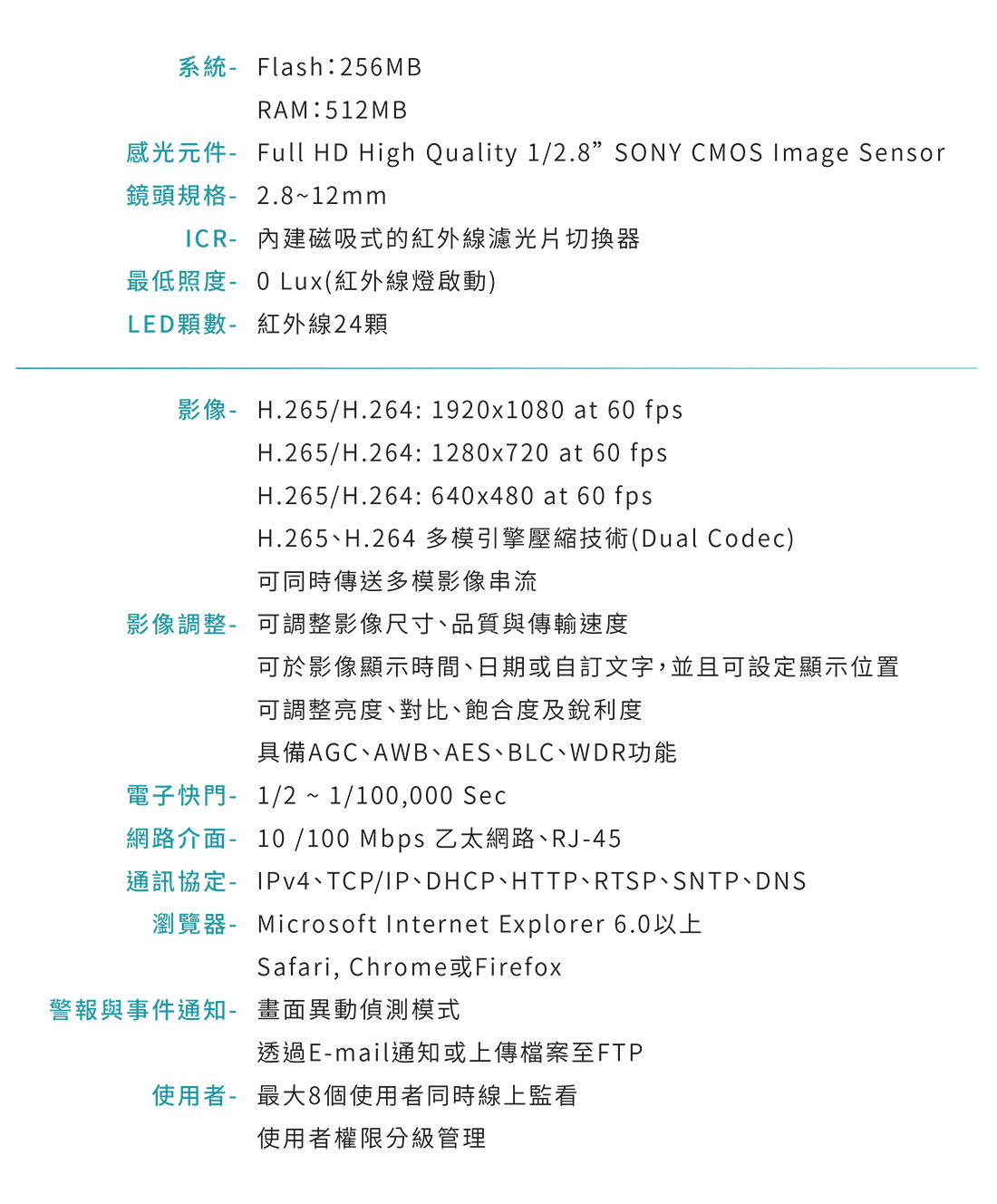 • SONY 2百萬像素 1/2.8 CMOS感光元件,影像品質極佳