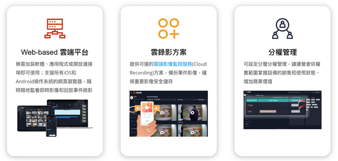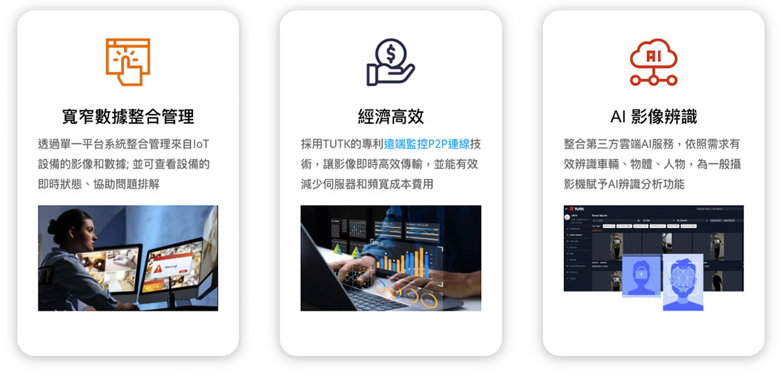 雲端影像管理系統提供遠端影像監控、錄影回放、事件錄影、權限管理等多項功能,讓企業客戶輕鬆管理所有監控設備。此外,透過物聯智慧的遠端監控P2P連線技術及TUTK RTC技術,將可為企業客戶大幅節省伺服器運營成本和網絡頻寬費用。