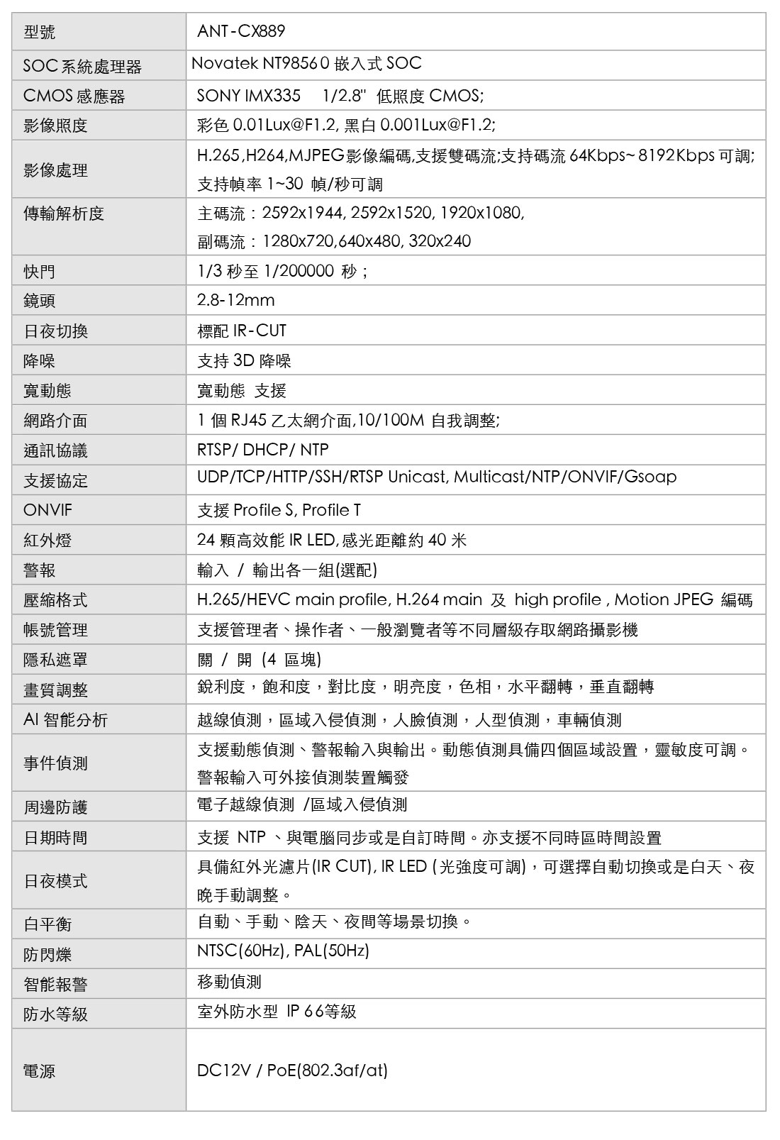 立巨500萬防暴手動變焦網路攝影機 ANT-CX889