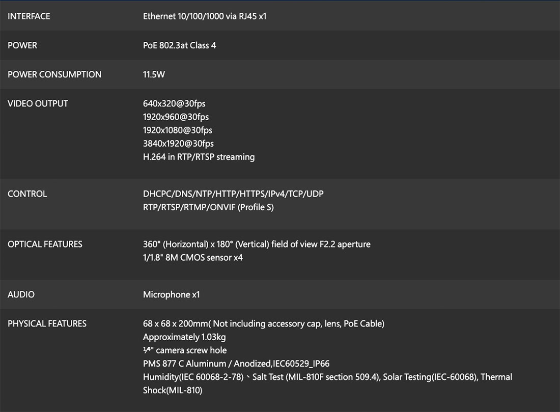 RX1000F 支援多種解析度與影格率設定,並採用 H.264 串流格式,支援 RTSP、HTTP 等主流通訊協定,能順利整合至既有 VMS、NVR 與後端管理平台,降低全景設備導入時的系統調整門檻。同時,RX1000F 支援 PoE 802.3at 供電,搭配金屬機構與 IP66 防護等級,設備可長時間運作於戶外、半戶外或工業環境中,承受溫差、濕度與粉塵等環境條件,透過 Cupola360 所提供的軟體平台與 API 架構,可延伸應用於人流觀測、行為判讀、異常事件提示與空間狀態掌握,單一全景畫面有助於建立一致的分析邏輯與穩定的管理視角。